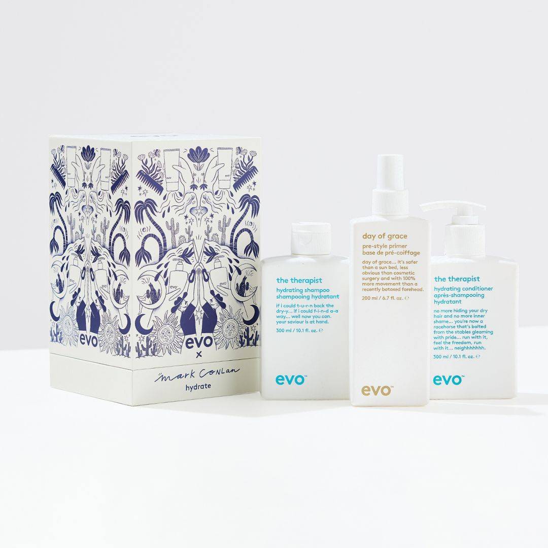 evo x Mark Conlan: hydrate is a limited collab set featuring hydrating must haves and a tote bag—gift ready for the holiday village.