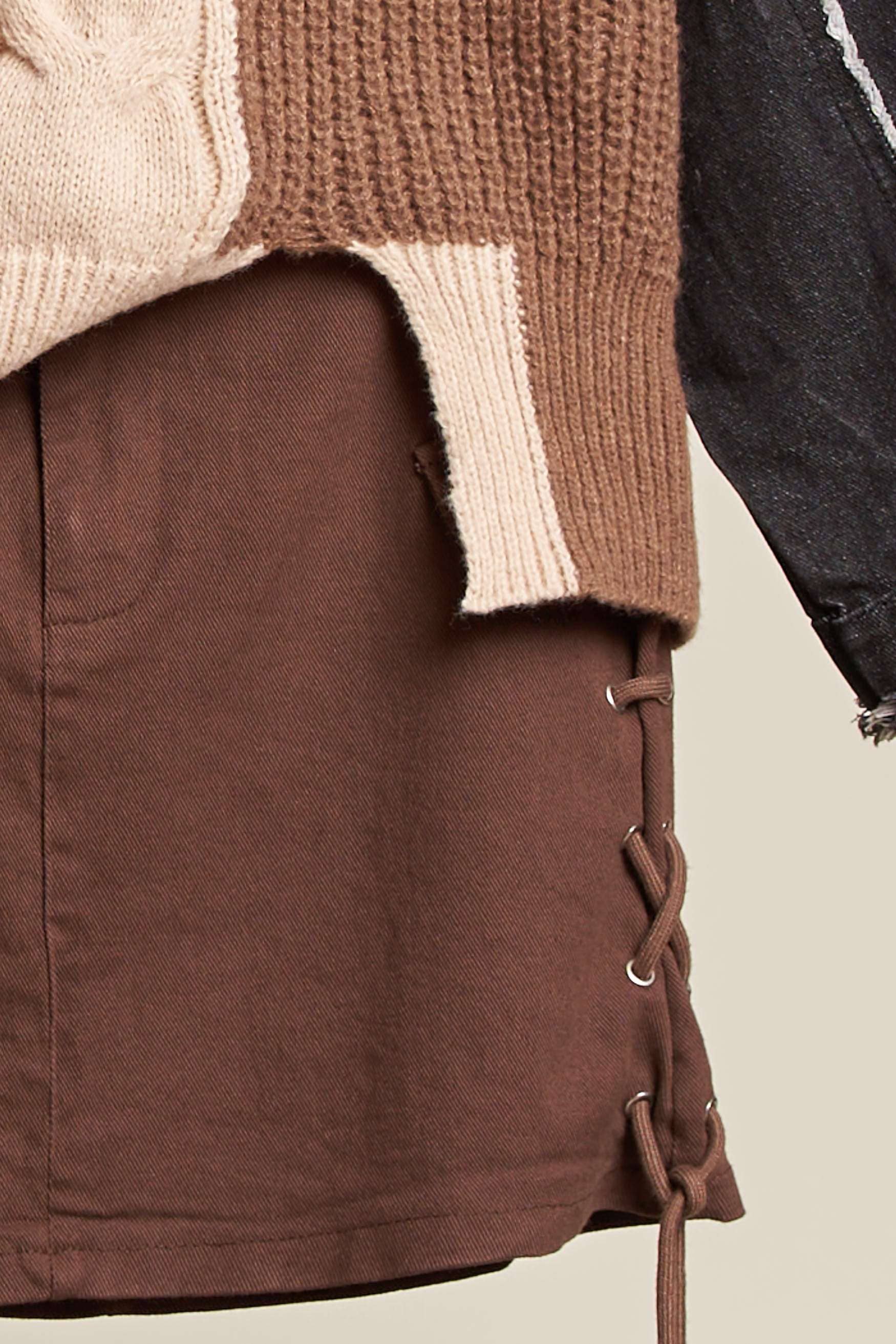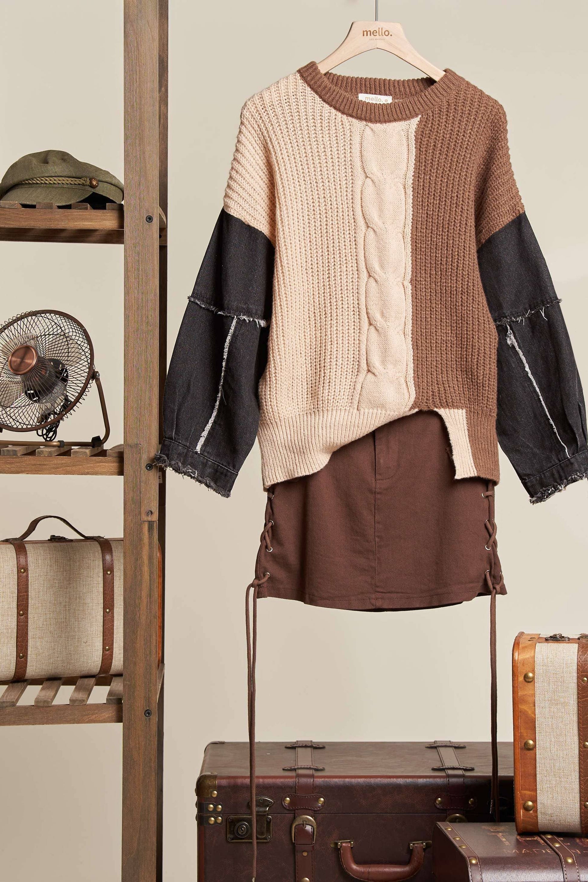 Multi Fabric Color-block Knitted Sweater with Distressed Denim Sleeve