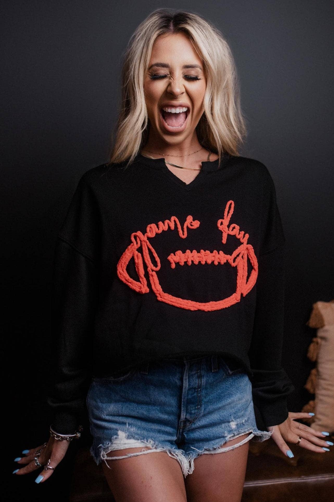 Get ready for football season with our Black Game Day Sweatshirt with Red Roped Embroidery