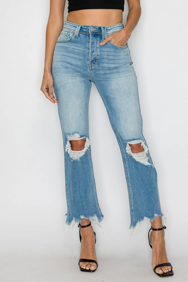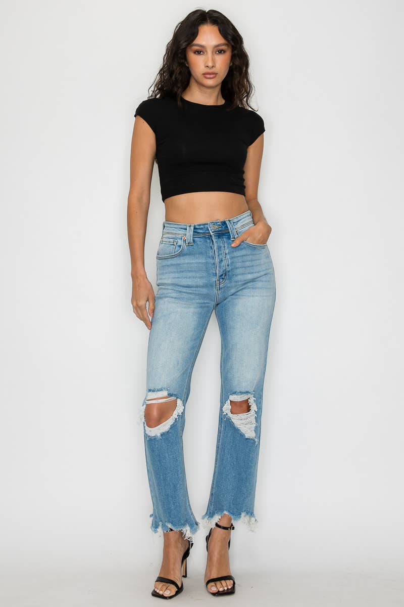 Effortlessly cool and endlessly versatile, these high-rise straight-leg jeans exude casual chic with their distressed knees, adding a hint of edge to your ensemble. Embrace laid-back sophistication and style these jeans effortlessly for any occasion, whether it's a casual day out or a night on the town.
